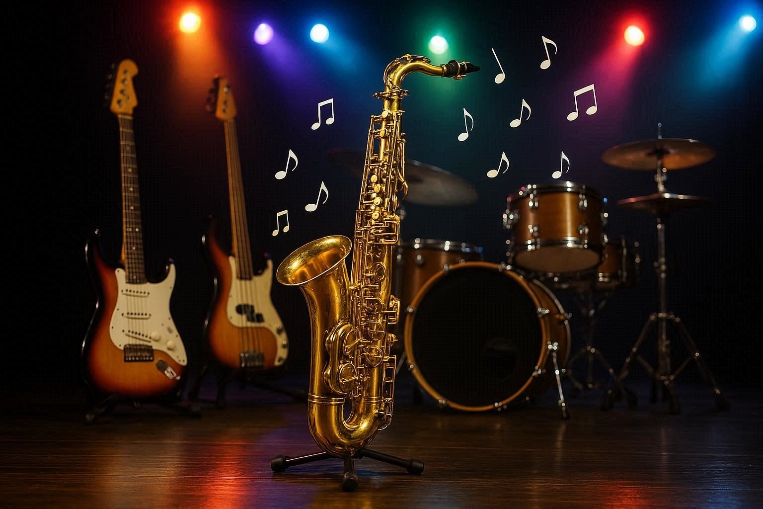 El saxofón es un instrumento de viento-madera con un timbre expresivo, que funciona mediante una caña que vibra al soplar aire en la boquilla y teclas que permiten variar la altura de los sonidos. Los modelos más comunes son soprano, alto, tenor y barítono, aunque también existen versiones menos habituales como el sopranino o el contrabajo. Inventado en 1840 por Adolphe Sax para bandas militares, alcanzó fama en las grandes orquestas de jazz de los años 40 y 50, y con el tiempo se incorporó al rock, pop y otros estilos, adaptándose a melodías suaves o solos enérgicos.