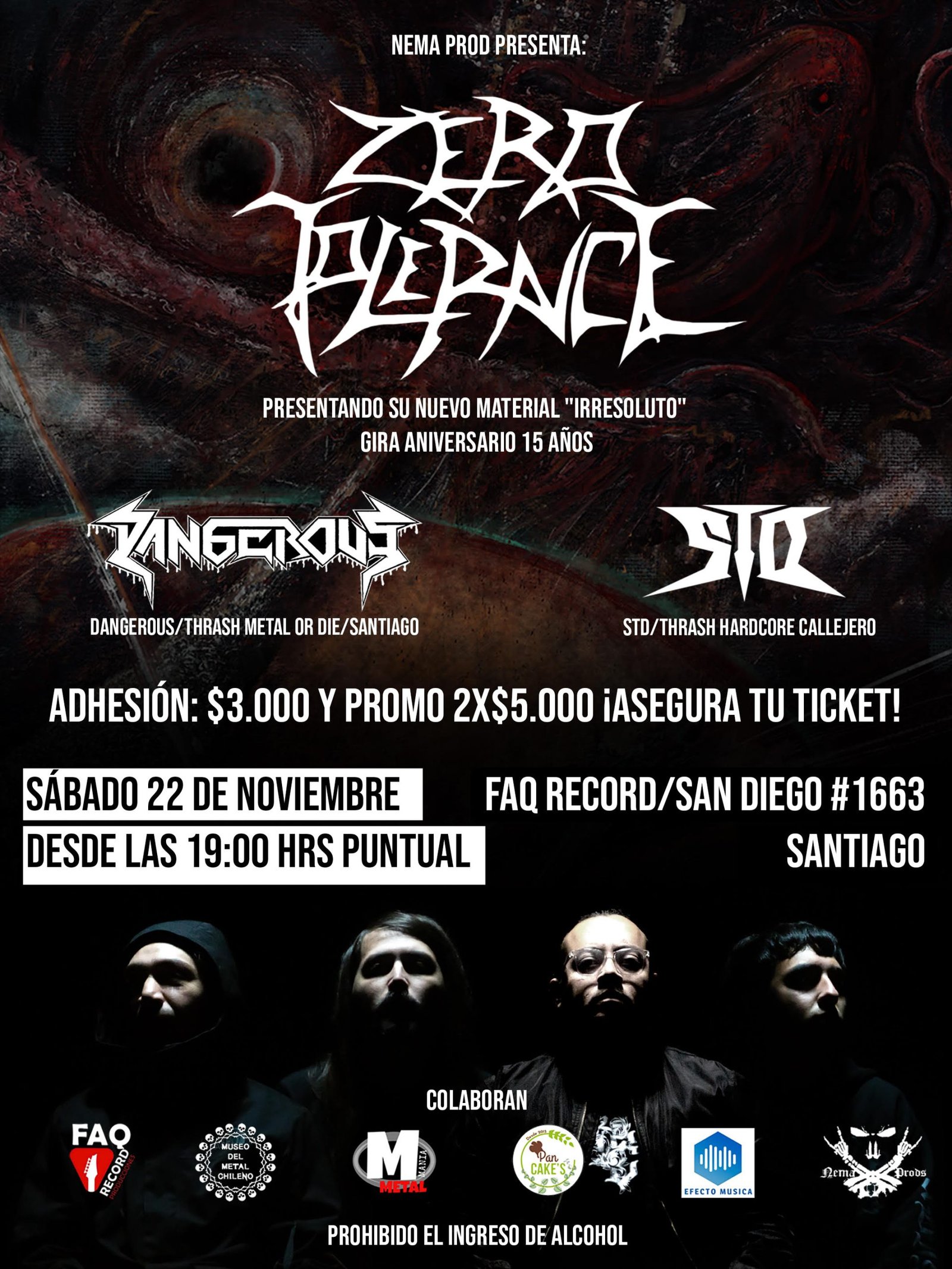 La banda Quillotana Zero Tolerance vuelve a la región metropolitana luego de un año y medio de ausencia, la espera ha sido larga, pero llegó finalmente el momento de un nuevo show en Santiago, esta vez será en el marco de su gira “Irresoluto Tour” que promociona su nuevo material que consta de un Ep el cual fue lanzado el 28 de septiembre y ha tenido muy buena recepción del público, el show se llevará a cabo en la sala Faq Record ubicada en San Diego #1663 desde las 19:00 horas/puntual, donde Zero Tolerance estará acompañado de las bandas STD (Slam To Death) con su poderoso Crossover Thrash y junto Dangerous que viene entregando una densa dosis de Thrash Metal, las tres bandas preparan un show fresco y cargado de potencia, la entrada tiene un valor de $3.000 por persona y una promo de 2 por $5.000, las entradas están a la venta desde ya, solo debes comunicarte con las redes sociales de las bandas para adquirirlas, organiza Nema Prod en otra jornada más de su tradicional “Metal Chileno”, asegura tu ticket y asiste.