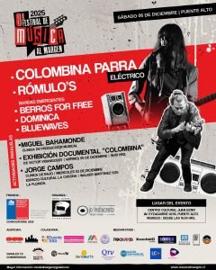 Este año, la programación estará encabezada por Colombina Parra —música, arquitecta, artista visual y poeta—, figura clave de la creación chilena contemporánea. Con una obra que transita con libertad entre el rock, el folclor y la experimentación, Colombina ha construido un camino propio, guiado por la fuerza de su poesía y el legado cultural de una familia fundamental para el arte chileno. Su concierto, programado para las 20:30 horas y de acceso gratuito previa inscripción, promete ser uno de los puntos altos del festival. En esta ocasión, la artista invitará al escenario a Noelia Ortiz, alumna de la Escuela de Rock de Puente Alto y a Nicole Naomi, bajista de San Ramón.