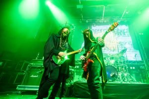 Desde que las luces se atenuaron, la estética de Imperial Triumphant dictó la atmósfera. Sus icónicas máscaras doradas y túnicas negras resplandecían bajo un juego de luces cuidadosamente diseñado, creando un contraste visual entre la elegancia del oro y la oscuridad del recinto. No parecía un show de rock convencional; se sentía como un ritual místico donde los sonidos tribales se entrelazaban con un caos controlado, ejecutado con la experticia técnica que caracteriza a Zachary Ezrin, Steve Blanco y Kenny Grohowski.
