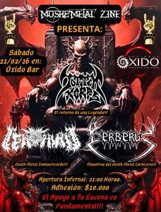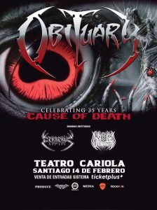 En la previa a sacar su nuevo disco, los consolidados death metal Cerberus, se presentarán este sábado 14 de febrero en el Teatro Cariola junto a los originarios de Tampa Florida Obituary, quienes celebrarán los 35 años, de su segundo disco, el emblemático “Cause of Death”. Cerberus, presentará gran parte de sus temas más brutales de los álbumes “Ebola” 2002, “Redemption of Demigod” 2010 y “Agony of Damnation” 2015. Asimismo, mostrará en vivo algunos temas nuevos de su próximo y cuarto disco, el cual está en pleno trabajo de composición y arreglos musicales.