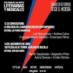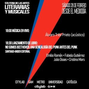 Este sábado 28 de febrero de 2026 se realizará la 5ta Feria de Artes Literarias y Musicales, organizada por Santiago-Ander Editorial y Polilla Records. Se realizará en Citylab, en el GAM, entre las 12:00 y 20:00 hrs., con entrada liberada, a pasos del metro Universidad Católica.