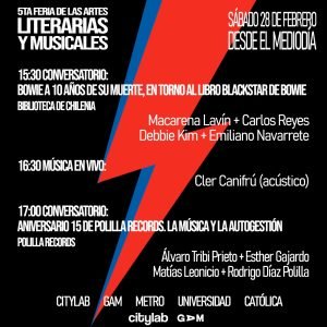 Destacamos la celebración de aniversario por los 15 años de Polilla Records; el conversatorio organizado por Los Perros Románticos sobre literatura chilena; la conmemoración de los 10 años sin David Bowie organizada por Biblioteca de Chilenia; y los lanzamientos de libros de Santiago-Ander sobre 100 películas de terror y Una genealogía del punk antes del punk