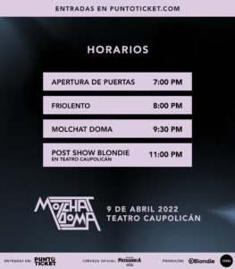 Durante el 2021 sobrepasaron los 120 millones de streams en Spotify, cuya canción “Sudno” se hizo viral a través de TikTok. . Su actuación en Santiago, será precedida por la presentación de los locales Friolento a las 20:00 horas, mientras que Molchat Doma subirá al escenario a eso de las 21:30 horas, y contará con fiesta post show en el mismo recinto (Caupolicán) a cargo de Centro de Eventos Blondie. Más información sobre horarios y recomendaciones: