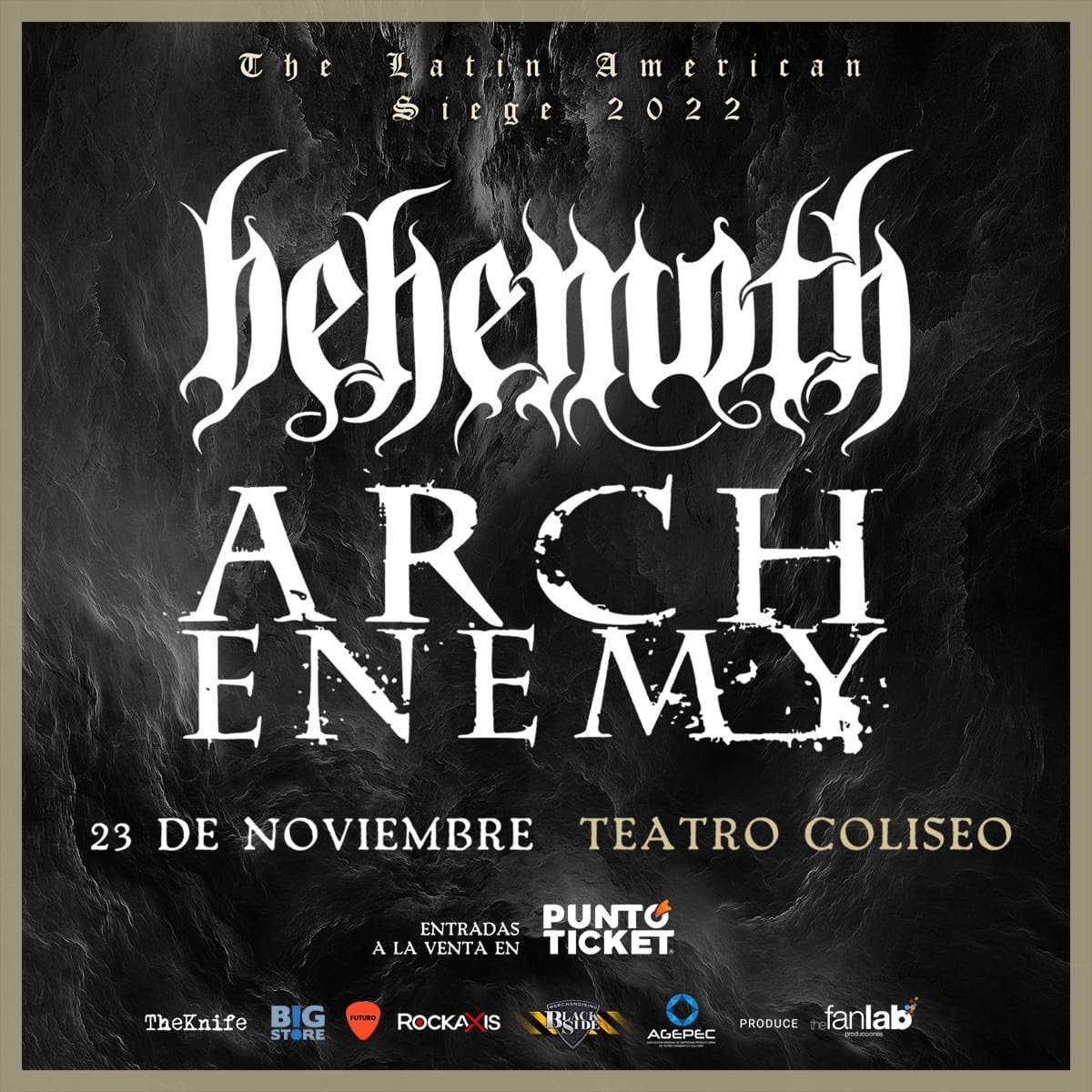 Las agrupaciones Arch Enemy, de Suecia y Behemoth, de Polonia, se unieron en “European Siege 2021”, exitosa gira que ahora los tendrá de visita en nuestro país. En esta oportunidad, las bandas más representativas del death metal a nivel mundial harán un recorrido por su extraordinario repertorio, en un concierto único que se realizará en el Teatro Coliseo, el próximo 23 de noviembre. Entradas disponibles en PuntoTicket.