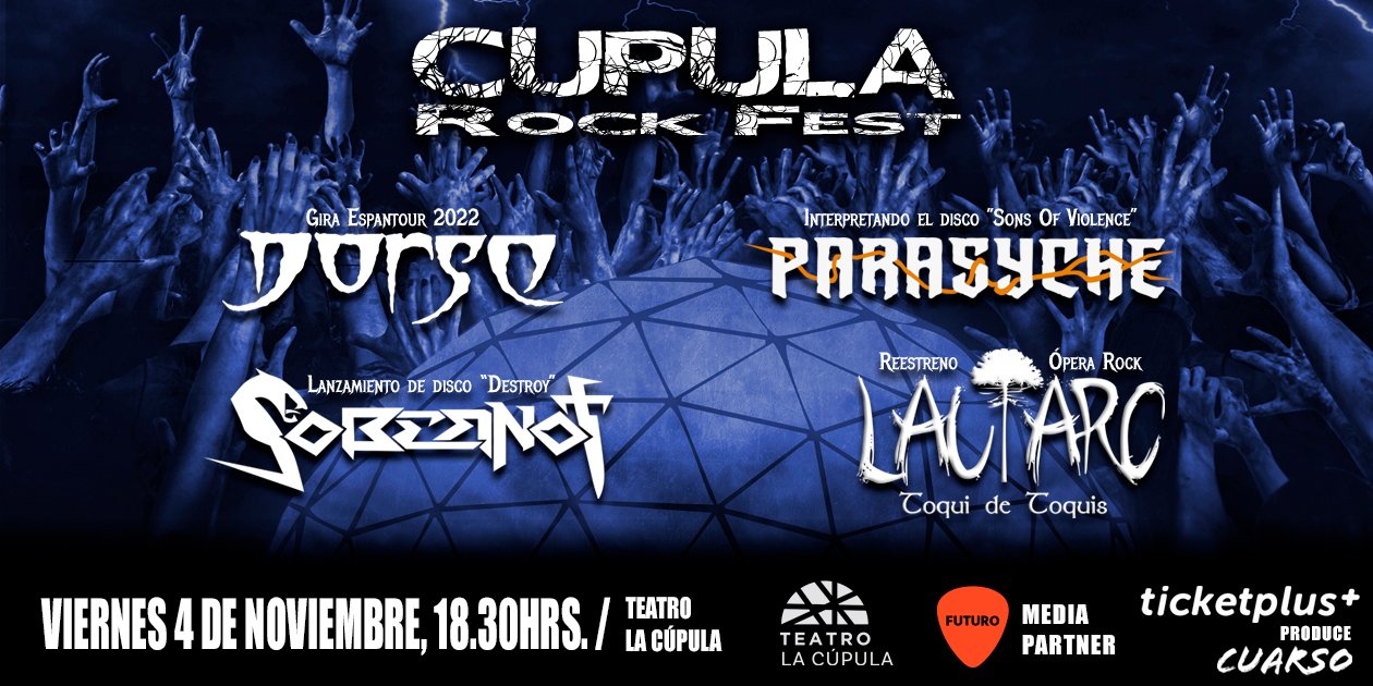 El Teatro La Cúpula del Parque O’Higgins es el recinto que recibirá la primera versión de Cúpula Rock Fest, ambicioso festival que reúne a 4 de las más llamativas propuestas del rock nacional, el próximo 04 de noviembre, comenzando a partir de las 18:30 horas. Los tickets se encuentran a la venta a través de TicketPlus.