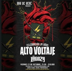 El próximo viernes 21 de octubre a partir de las 21.30 hrs., la legendaria banda Alto Voltaje celebrará sus 24 años de trayectoria, junto a Lügozy, en Bar de René, ubicado en Santa Isabel 0369. Providencia.