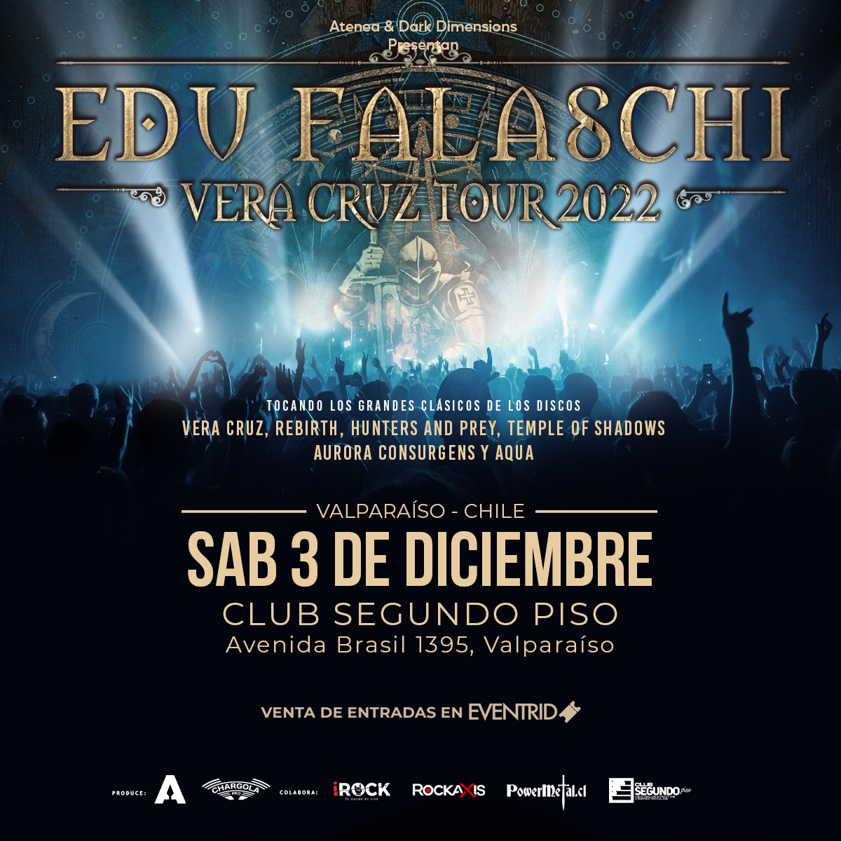 Atenea trae por primera vez a Chile a Edu Falaschi junto a su banda. El cantante de renombre mundial ya se ha presentado en algunos de los festivales más importantes del mundo como Rock in Rio (Brasil), ProgPower (USA), Gods Of Metal (Italia), Wacken Open Air (Alemania) y Loud Park (Japón) y también en muchos conciertos y festivales como cabeza de cartel en Brasil y en el extranjero. La banda es conocida por sus increíbles presentaciones en vivo donde muestran sus poderosas canciones heavy-power cumplidas con las habilidades técnicas y melodías del más alto nivel desde el principio hasta el final.