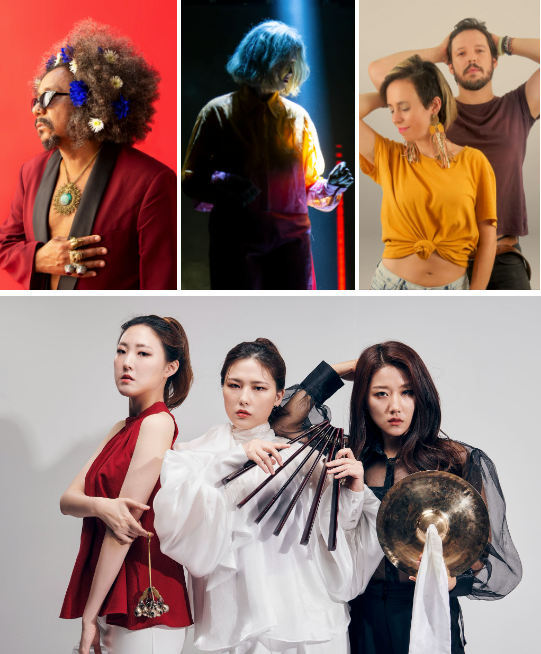 Siguiendo con lugares distantes, tres percusionistas de imponente presencia y gran virtuosismo se agrupan en groove&, lo particular del proyecto no recae solo en el nombre, pues su configuración de ritmos y armonías a partir de la madera y el metal las convierten en unas fieles representantes del sonido de su país, Corea del Sur. Instrumentos como janggu, el kkwaenggwari y el yunluo ocupan la primera línea de esta potente expresión World Music en Asia. Lionel Kizaba aterriza desde la República Democrática del Congo con su electrónica afro local. Radicado en Canadá, el músico fusiona idiomas, mezcla sonidos del soukous congoleño, se empapa del afrobeat y también del pop rock. En escena, con su voz y percusiones, logra un viaje afro futurista que incluye visuales con máscaras 3D e imágenes creadas por artistas visuales congoleños.