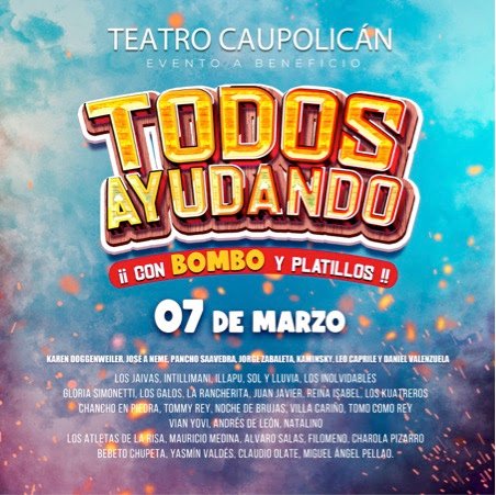 Bombo Fica creó el evento a beneficio llamado “¡TODOS AYUDANDO CON BOMBO Y PLATILLOS!”, un espectáculo imperdible donde varias figuras de la música, humor y espectáculo se juntan para colaborar con esta noble causa y ayudar a las personas afectadas por los incendios ocurridos en el sur del país. El evento se realizará el próximo martes 7 de marzo, a las 17:00 horas, en el Teatro Caupolicán. Toda recaudación irá en ayuda a los damnificados.