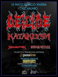 La agrupación DEICIDE volverá a suelos latinoamericanos este 2023 y en esta oportunidad junto a los canadienses KATAKLYSM, otra importante agrupación del género, y los nacionales de Soulburner y Human Vestige, que serán el complemento perfecto para un intenso ritual de oscuridad brutal.