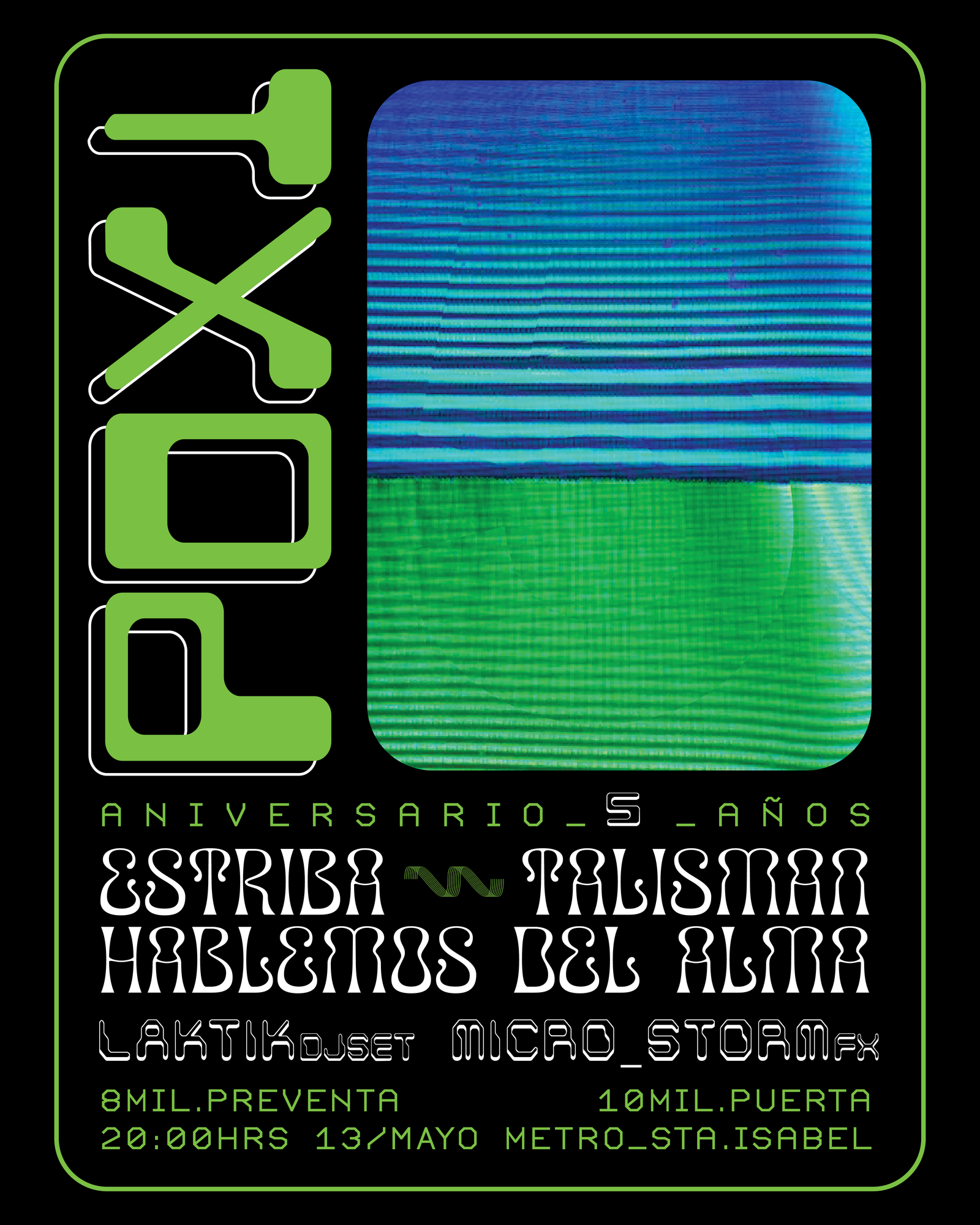 Este sábado 13 de mayo el sello independiente Poxi Records cumple 5 años y para celebrarlo se presentarán las bandas: Estriba, Talismán y Hablemos del Alma. Las bandas pertenecen al catálogo de la discográfica y están marcando el pulso del sello en diferentes fiestas y tocatas del underground con shows imperdibles.
