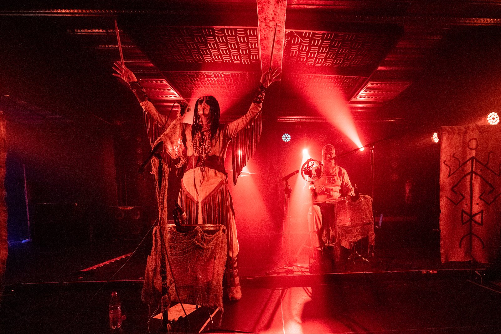 Y como sumergiéndonos en un ritual chamánico en una lejana Siberia cubierta de nieve y magia, a eso de las 20 horas debutaba en nuestro país el dúo ruso Nytt Land y todo su nordic dark folk al hueso y sin tregua. Nos sentimos siendo espectadores de como “Shaman” y “Baba Yaga” (así es como se denominan Anatoly Pakhalenko y su esposa Natalya) llegaban desde las tierras del norte de Rusia y volcaban en nosotros todo su poder arrollador, lleno de folklore nórdico que nos dejaba sin aliento.