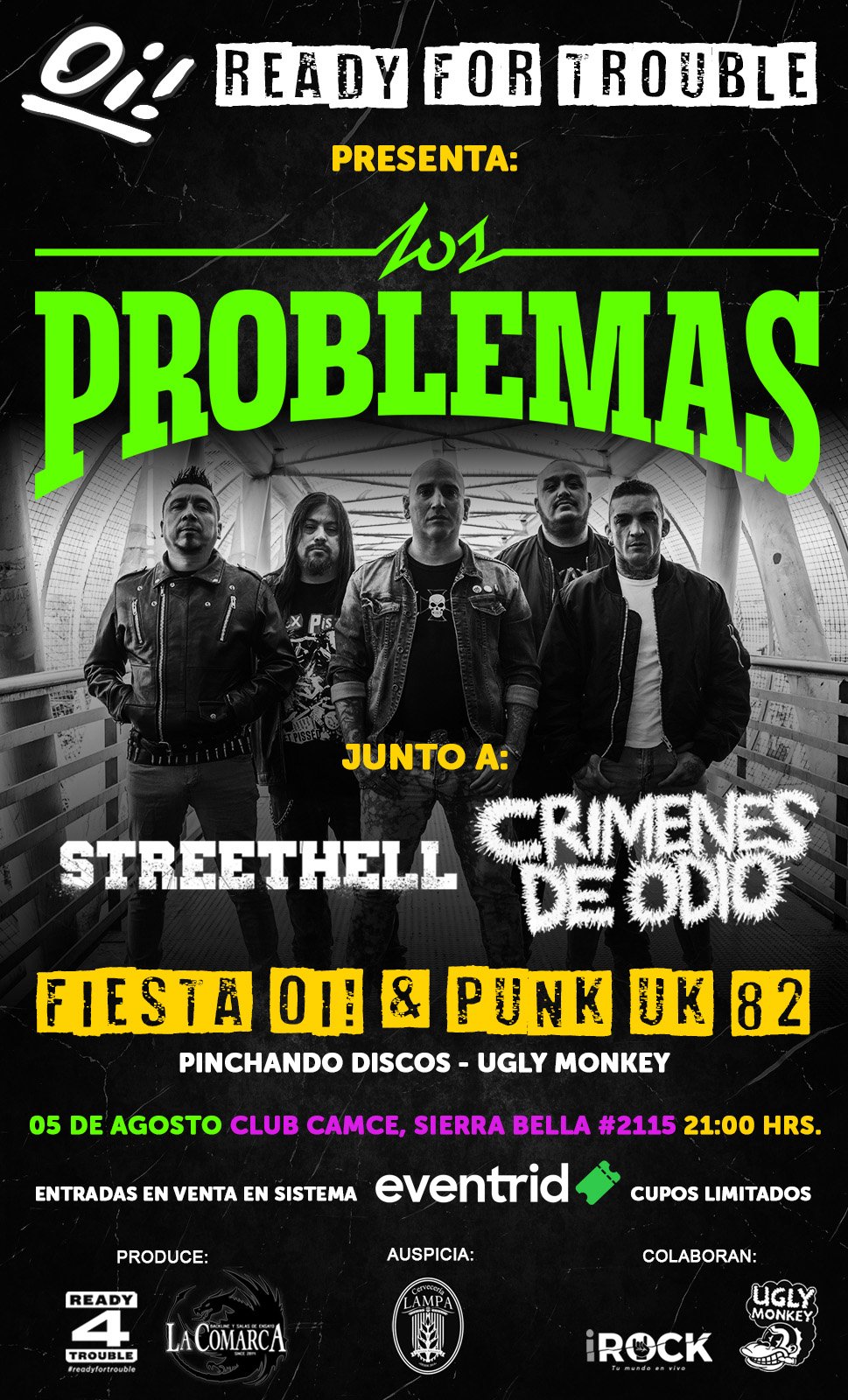 Luego de una larga espera, la banda de punk rock y Oi! creada en pandemia “Los Problemas”, anuncia su primer concierto en vivo en la ciudad de Santiago. La presentación se llevará a cabo el día 5 de agosto en el Club Camce, ubicado en Sierra Bella 2115. Las puertas del local abrirán a las 21:00 hrs.