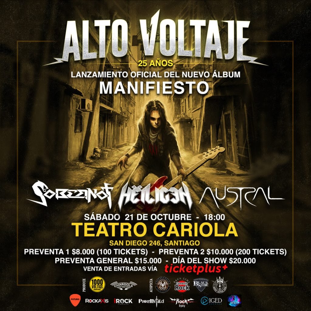 El evento contará con invitados de lujo: Sobernot, Heiligen y Austral, quienes se encargarán de abrir los fuegos, para continuar con el estreno en vivo del cuarto disco de estudio de Alto Voltaje, llamado “Manifiesto”. Nuevo trabajo que, en sus líricas, narra los acontecimientos y vivencias de un barrio o población que podría ser de cualquier parte de Chile, sumado a todos los clásicos de la banda.