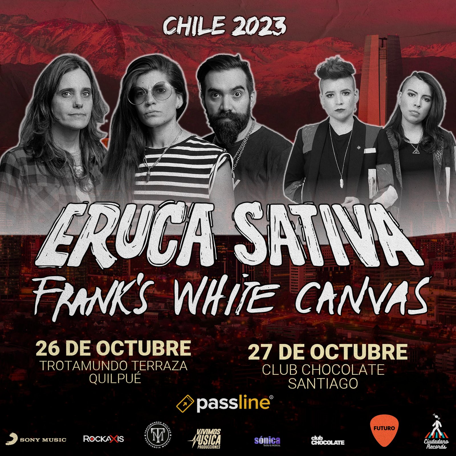 Con un nuevo disco recién editado – XV Años En Vivo En Estadio Obras – y una importante nominación en los premios Grammy – Mejor Álbum de Rock por “Dopelganga” – Eruca Sativa se prepara para un gran reencuentro con los fans chilenos, en dos espectaculares conciertos que se realizarán el 26 de octubre en Trotamundo Terrazas en Quilpué y el 27 de octubre de Club Chocolate.
