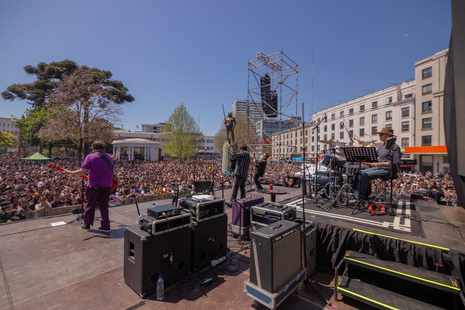 Los Tres, la banda más importante del rock chileno reunida con su formación original y más emblemática, brindó un emocionante concierto gratuito en la Plaza de la Independencia de Concepción, justo en medio de dos lugares significativos para la historia del grupo: el Aula Magna, donde hace décadas debutaron como grupo tocando junto a Los Prisioneros; y el Teatro de la Universidad de Concepción, donde tocaron por última vez en la ciudad antes de separarse la formación original en 2000, hace 23 años.