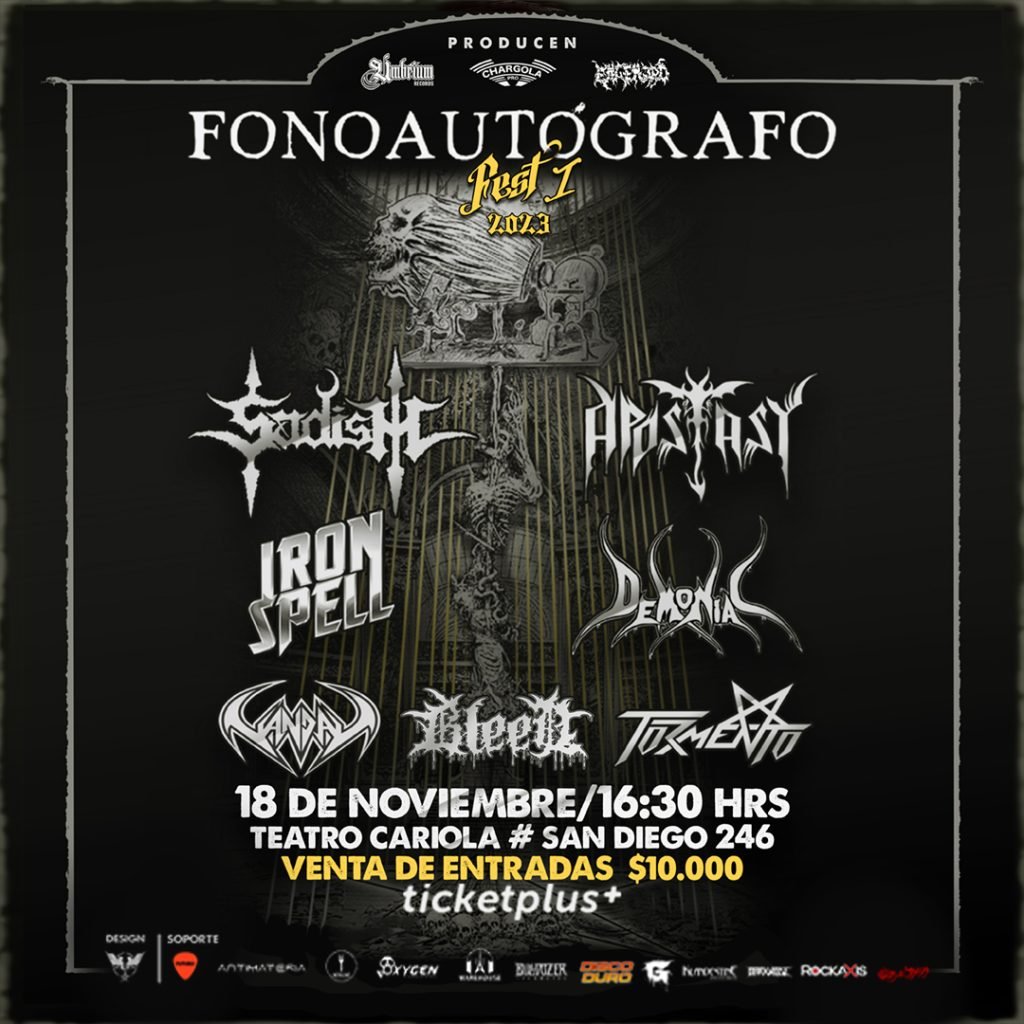 Apostasy, legendarios estelares de un brutal black thrash metal directo desde el puerto de Valparaíso celebrando 35 años de carrera. Demoniac, presentando su reciente obra “Nube Negra” en una revolucionara presentación. Iron Spell, y su eterno pacto con el hierro, perfecto para todos los amantes del más puro y verdadero heavy metal. Tormento, y su oscuro heavy metal conquistando y arrasando con su brutal agresión. Vandal, desde Melipilla presentando su álbum “Obertura“. Y se suman también como invitados especiales desde Rancagua, Bleed, presentando su última producción “Magna Morte“.