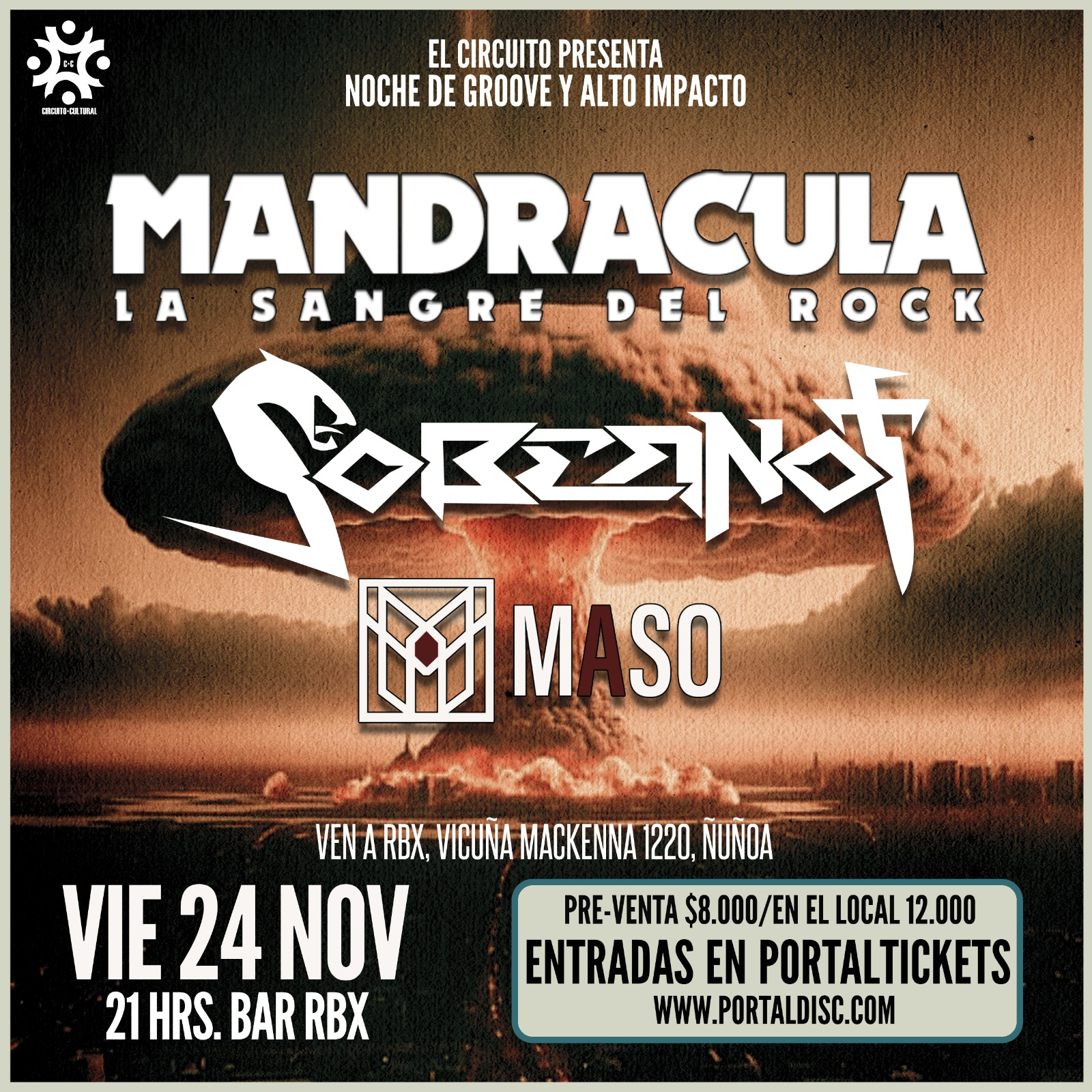 Este viernes 24 de noviembre en la Sala RBX, se conjugan más de 25 años de la historia del rock chileno. Mandrácula, Sobernot y Maso se toman el recinto de Vicuña Mackenna para llenarlo de rock, funk, groove y metal.
