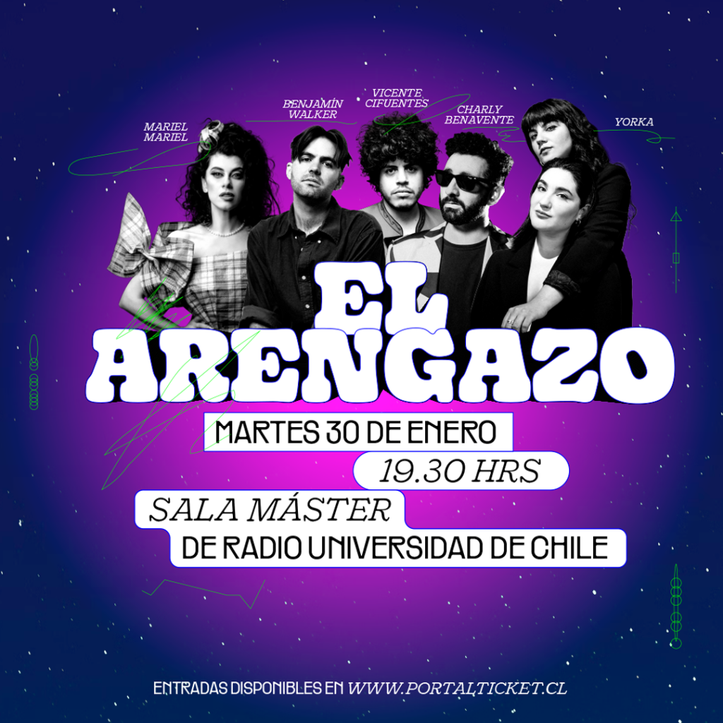 El Arengazo es el rito de compañerismo de cinco artistas que se admiran y respetan. Es la voz de una generación que ha compartido canciones, escenarios y una amistad. Un concierto ritual para motivar y entusiasmar a los nuevos representantes de Chile para hacer historia con la fuerza del público, los amigos y la familia en la cercana Sala Master.