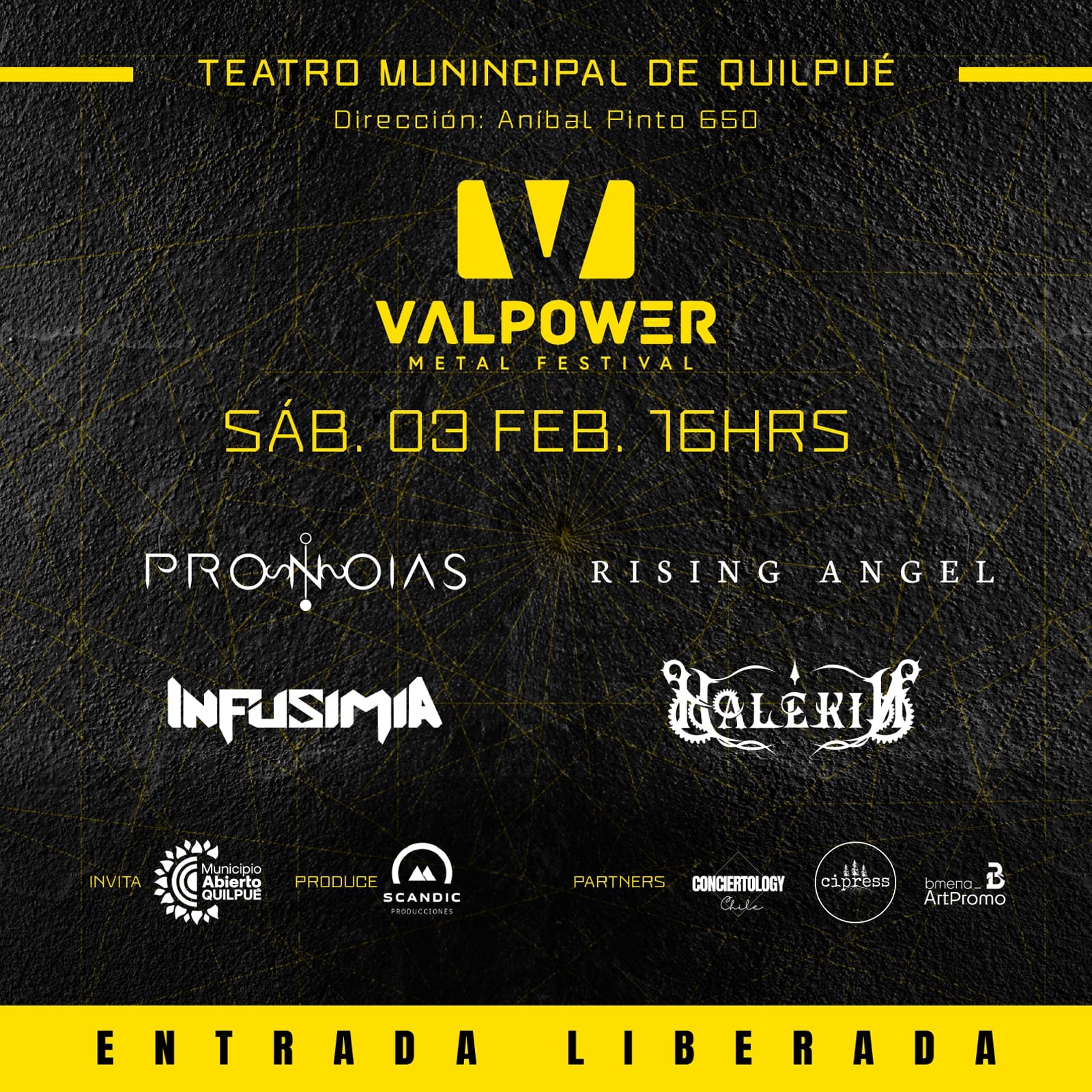 El evento se realizará en el Teatro Municipal de Quilpué (Aníbal Pinto #650, Quilpué) y contará con la participación de Pronoias, quienes acaban de lanzar su álbum debut “Creamos Nuestra Propia Realidad”, así como también los nacionales Rising Angel, Infusimia y Halekin, prometiendo varias horas de power metal a la vena y gratis.