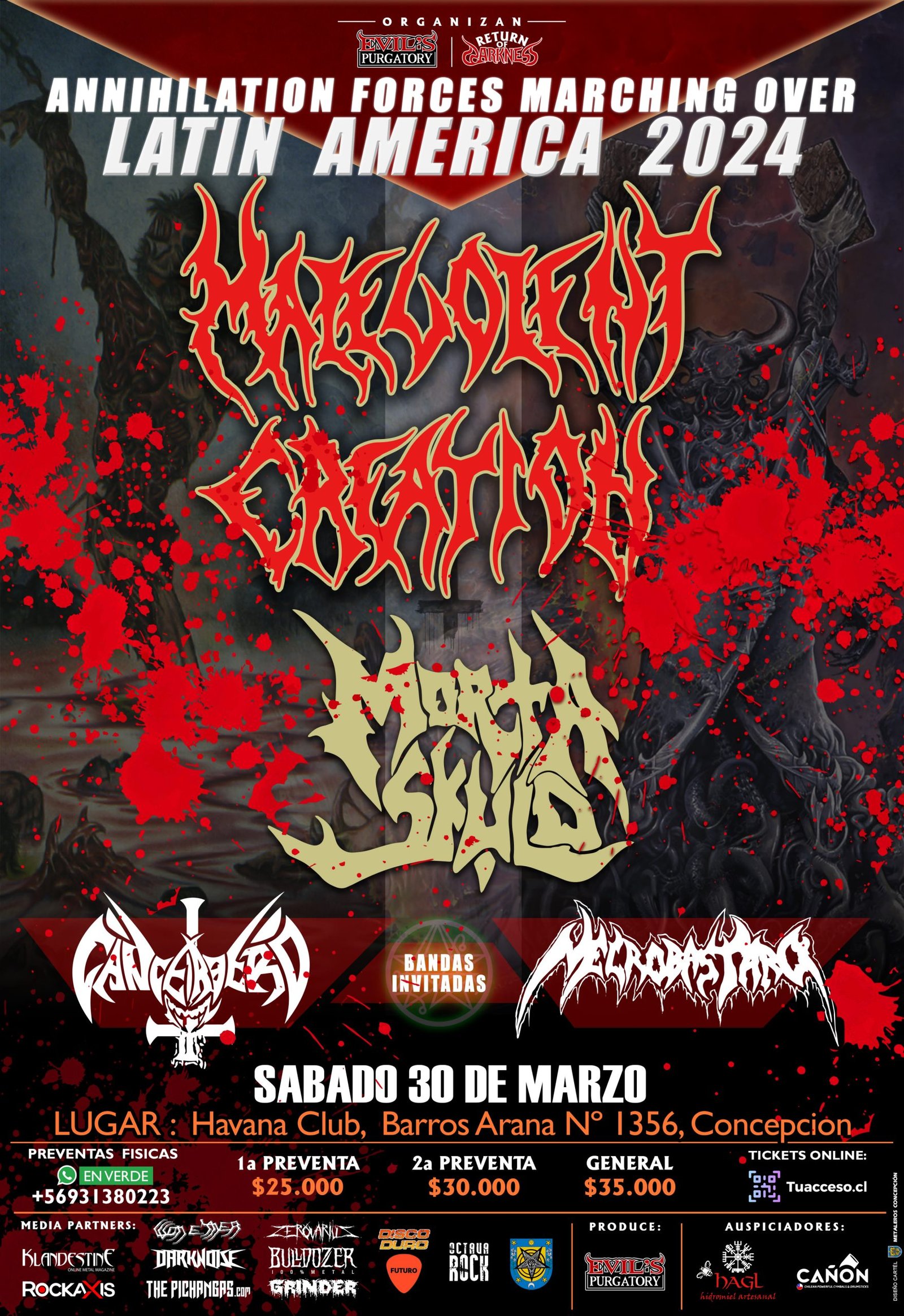 La tercera es la vencida, y por primera vez en la capital del Bio Bio, tendremos a los íconos norteamericanos del death metal, Malevolent Creation, que vuelven a Chile y que por primera vez lo harán en Concepción, para presentarse esta vez, junto a otros clásicos estadounidenses del género: Mortal Skuld. Una imperdible jornada de potencia y brutalidad que se llevará a cabo el día sábado 30 de marzo 2024 en el Havana Club (Barros Arana #1356) “Annihilation Forces Marching Over Latin America” es el poderoso nombre de la gira que trae a estos próceres del death metal de los Estados Unidos, que por más de treinta años han desplegado sus arsenales de pesada artillería manteniendo vivo el espíritu más sangriento y oscuro.