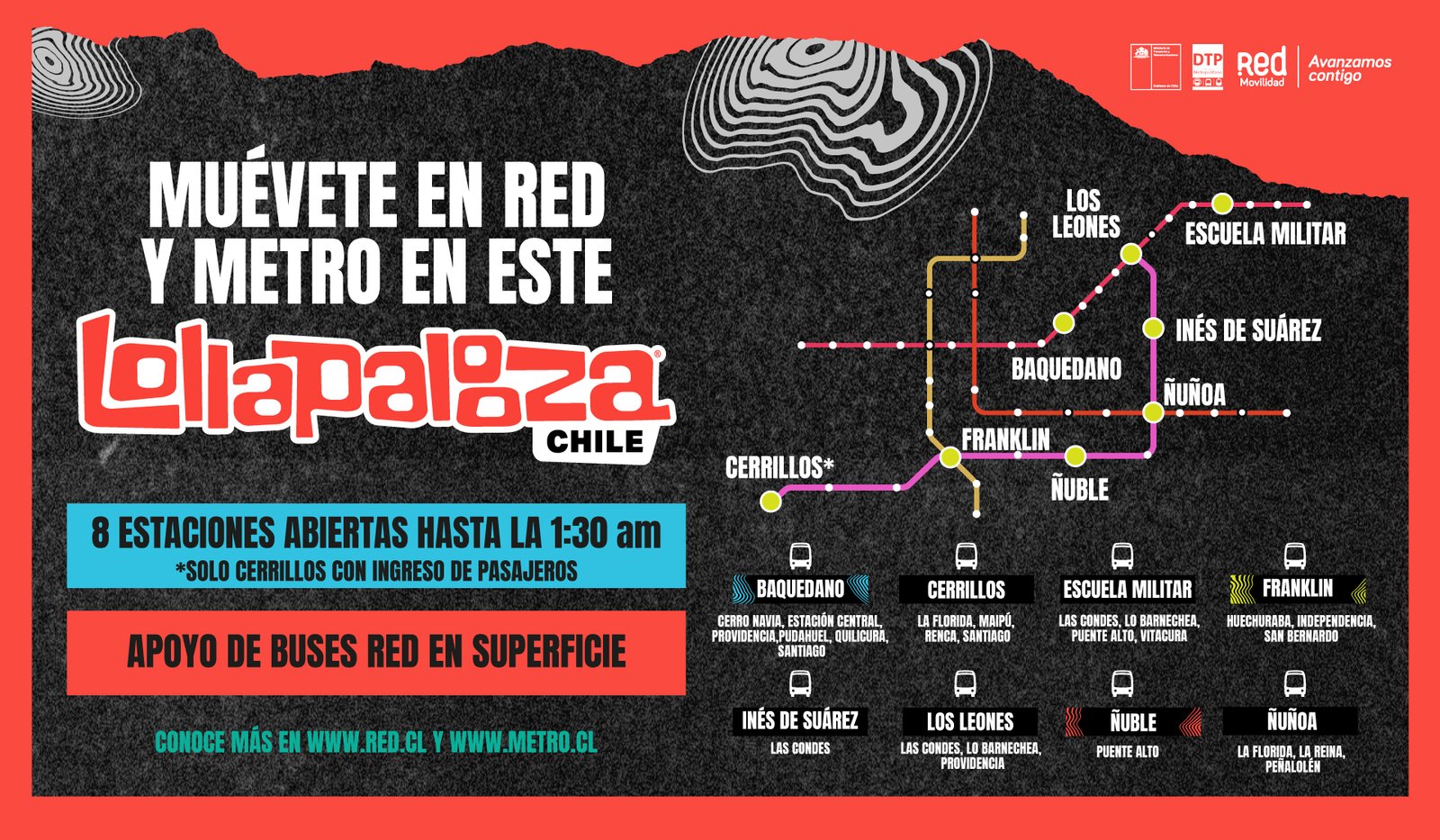 El próximo 15, 16 y 17 de marzo se abrirán las puertas del Parque Cerrillos para recibir el evento musical más importante del año: Lollapalooza Chile 2024. Para ello la producción da a conocer información útil que busca brindar una experiencia grata a los asistentes y al entorno, para su duodécima edición. Entre ellas destaca que Metro extenderá su horario de funcionamiento y Red Movilidad reforzará y sumará recorridos.