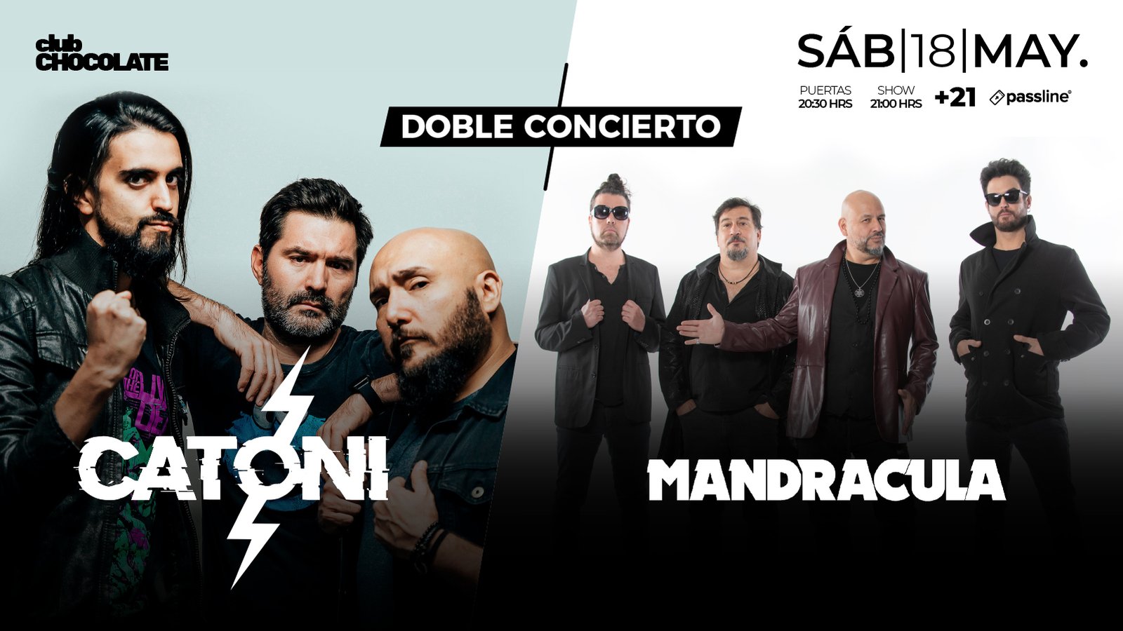 Mándrácula, actualmente conformada por sus miembros fundadores, Pancho Rojas y Miguel Ángel Pérez. Junto a sus recientes adiciones, Sebastian Arriagada en Guitarra y Sergio Carlini (Boa) en Batería. Se encuentran trabajando en nuevo material de estudio por primera vez en 23 años desde el lanzamiento del el laureado Sexy (2001). Este show es una oportunidad única de oír las nuevas composiciones con una puesta en escena y técnica como la que ofrece Club Chocolate, ¡por primera vez!