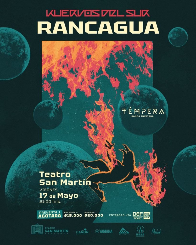 Luego de sus recientes y exitosas presentaciones en Copiapó y Vicuña, la banda de rock de raíz Kuervos del Sur se presenta el próximo viernes 17 de mayo a partir de las 21 hrs. en el Teatro San Martín de Rancagua; lugar donde además serán acompañados por la banda Témpera.