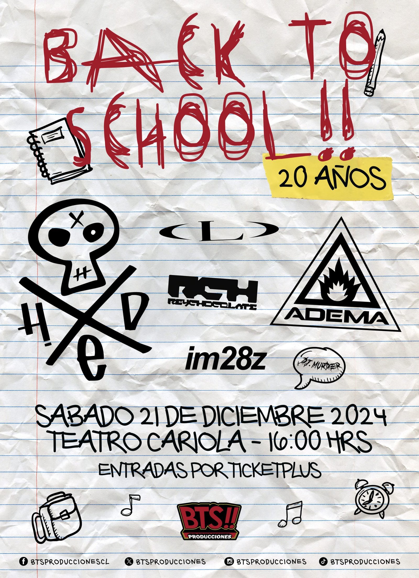 El “Back to School!!” regresa este 2024 para celebrar junto a Hed Pe y Adema nada más ni nada menos que sus 20 años, el próximo sábado 21 de diciembre en el Teatro Cariola.