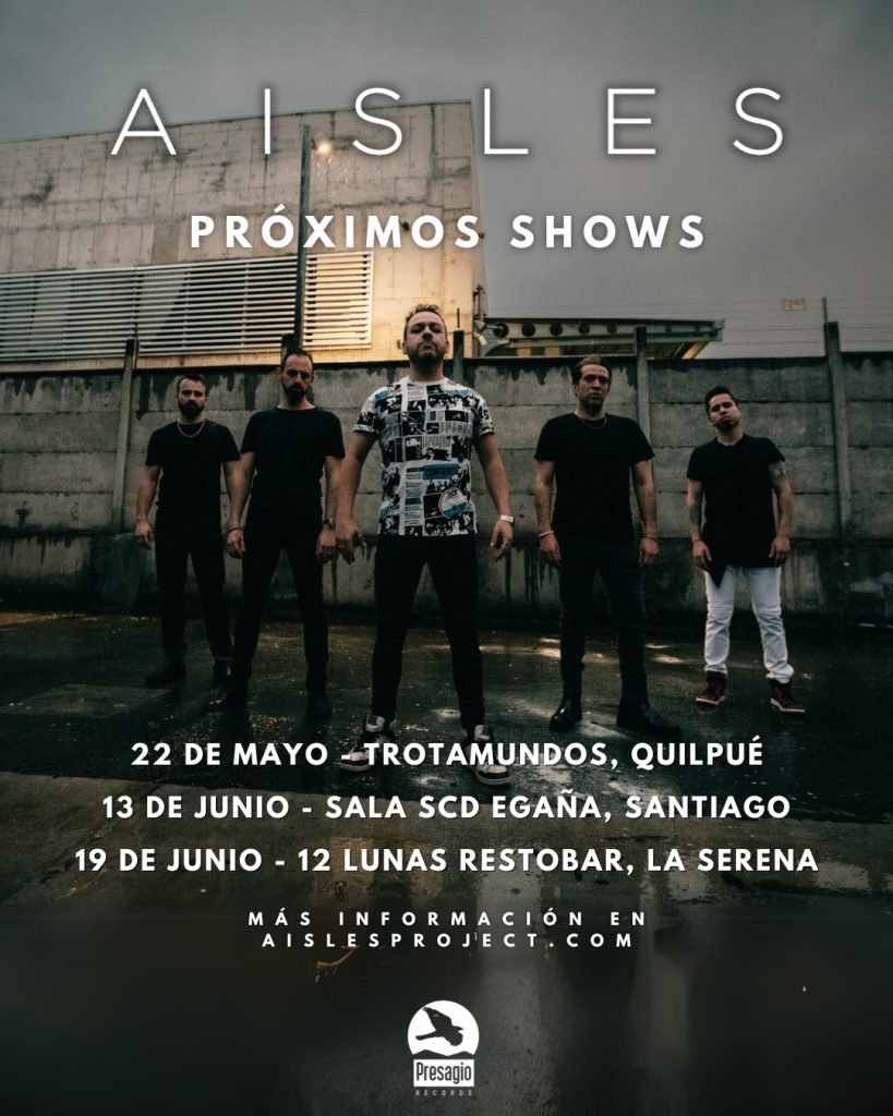 Además, Aisles debutará en la ciudad de Quilpué este 22 de mayo, en el reconocido bar Trotamundos, epicentro de la música nacional en la Quinta Región. Las entradas se encuentran disponibles a través del sistema Passline con un valor en preventa por $12.000.