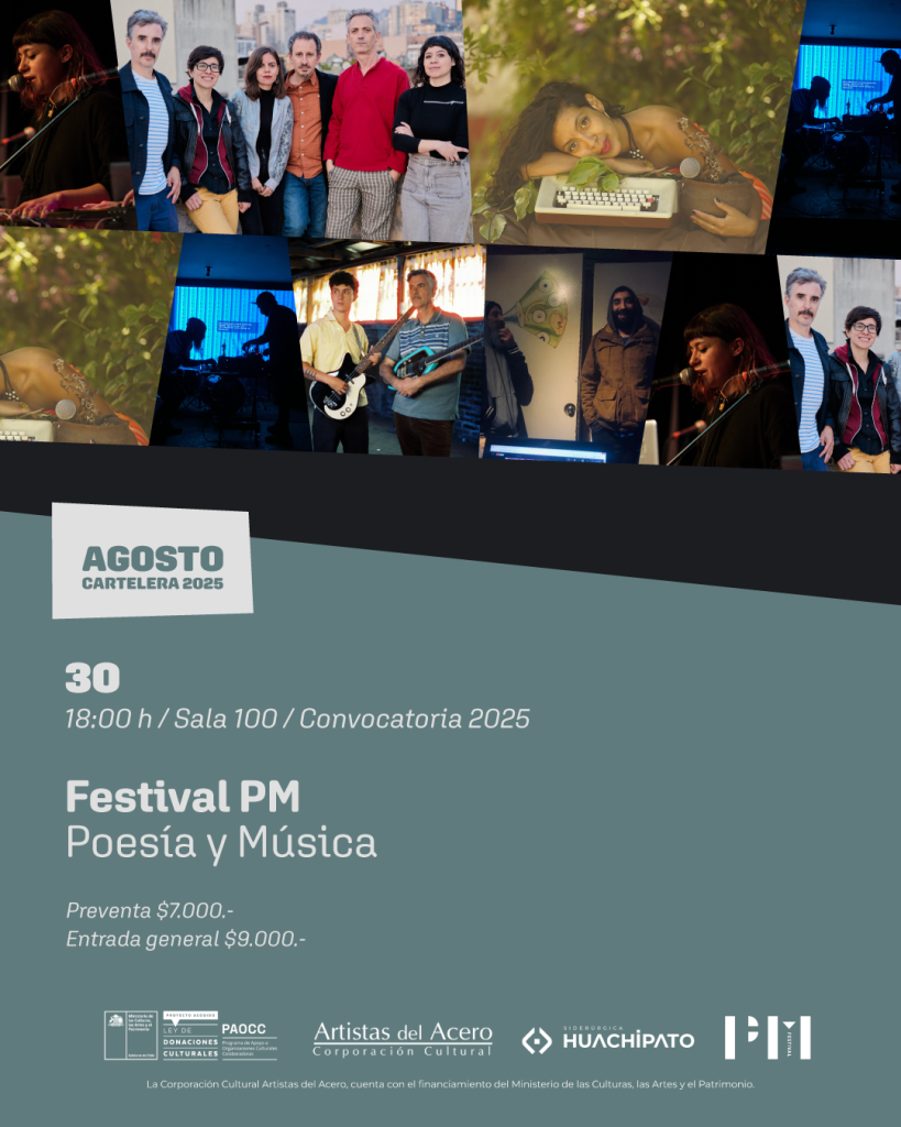 El Festival PM Poesía y Música regresa a Concepción el sábado 30 de agosto con una jornada que combina poesía, música y arte visual. La jornada contará con una feria abierta con exposiciones, actividades para toda la familia y una serie de presentaciones en vivo de destacados artistas locales y nacionales en la Sala Principal de Artistas del Acero.