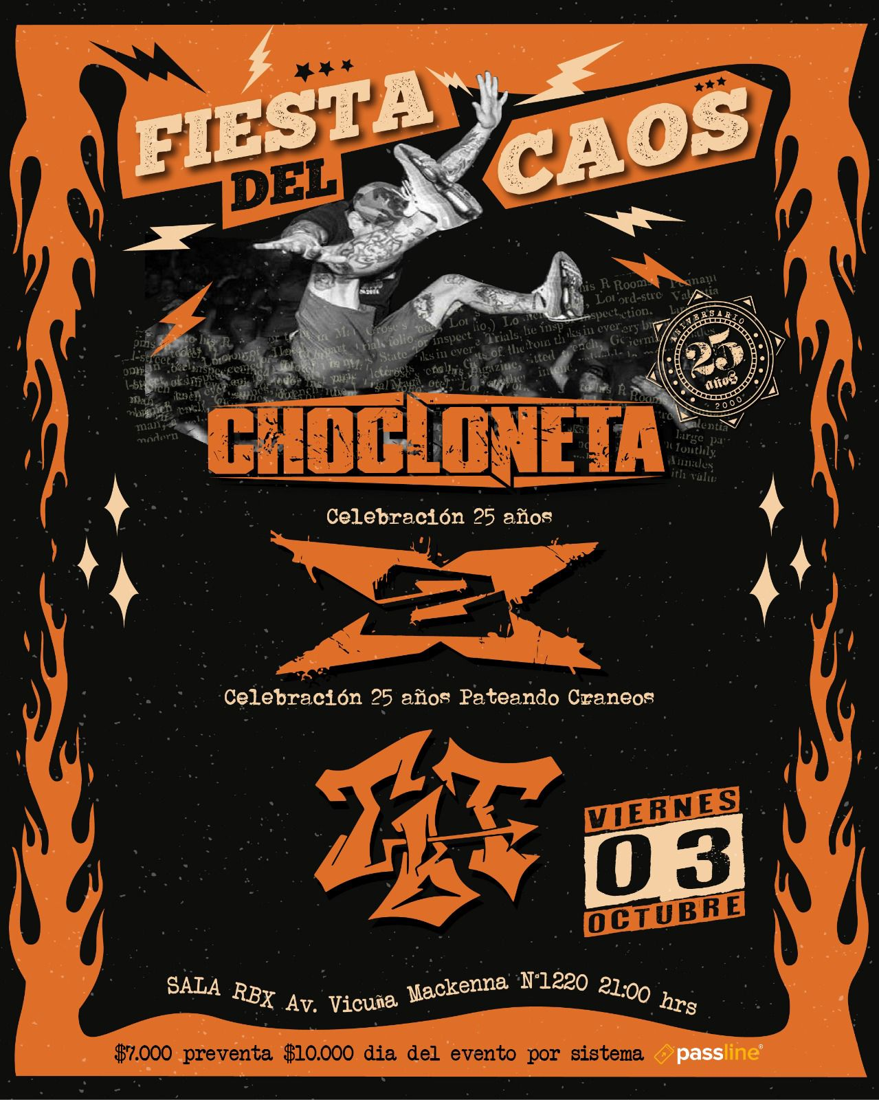 2X: Celebrando los 25 años de nuestros amigos de Chocloneta, nada menos que 25 años de perseverancia y música. A eso se suman los 25 años de nuestro disco Pateando Cráneos que además de una gira nacional lanzaremos la primera edición en vinilo de esta placa ¿Y qué mejor que hacerlo junto a nuestros nuevos compañeros de ruta, The Black Tula? Una noche de pura hermandad y rock.