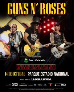 Guns N’ Roses, convertida en un ícono de los ’90 y una de las agrupaciones favoritas del público nacional, vuelve al país para revivir los himnos que marcaron a varias generaciones. El show, agendado para el martes 14 de octubre a las 20:30 horas, en el Parque Estadio Nacional, contará con la participación de la banda chilena La Mala Senda, invitada especial que abrirá este concierto catalogado como uno de los más esperados del año. Últimos boletos para cancha preferencial y cancha general, disponibles en PuntoTicket.