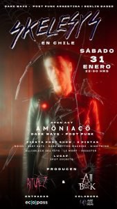 El artista argentino radicado en Berlín SKELESYS llega por primera vez a Santiago de Chile el próximo sábado 31 de enero de 2025, en un evento producido por Ritualz y All is Black, que promete ser una noche intensa de atmósferas oscuras, energía club y post-punk contemporáneo.