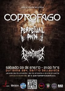 El sábado 03 de enero, Óxido (Barrio Bellavista) recibe una noche enfocada en la técnica, la intensidad y la crudeza del metal extremo: Coprófago realiza su única fecha en Chile, acompañado por Perpetual Pain y Genofagia. Un cartel hecho para quienes escuchan el death metal con cuello… y neurona.
