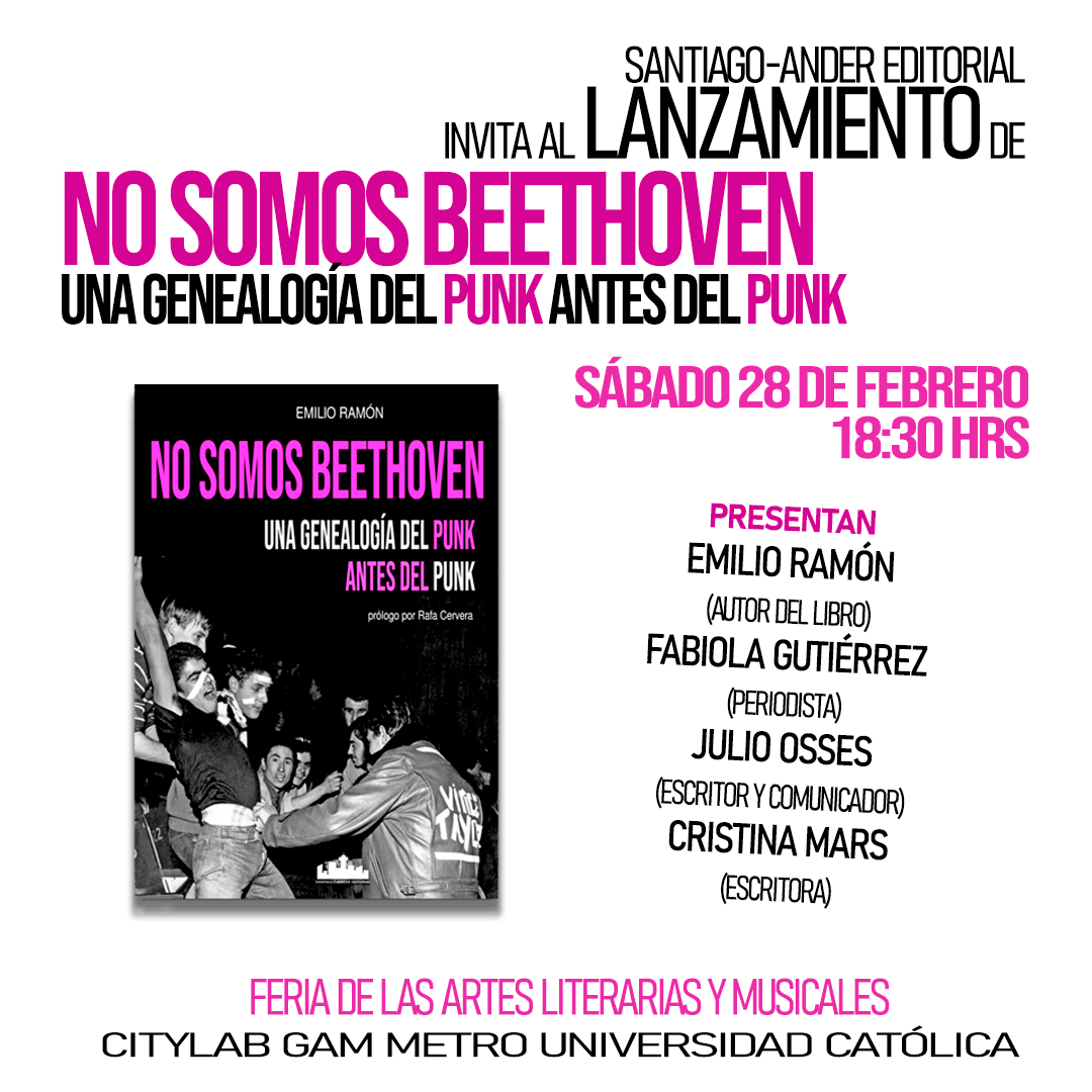Santiago-Ander Editorial anuncia el lanzamiento de No somos Beethoven. Una genealogía del punk antes del punk, nuevo libro del escritor e investigador chileno Emilio Ramón, un ensayo que propone una lectura provocadora y documentada sobre los orígenes del punk como herencia del rockabilly y rock and roll de los años cincuenta, y del garage rock de los sesenta.